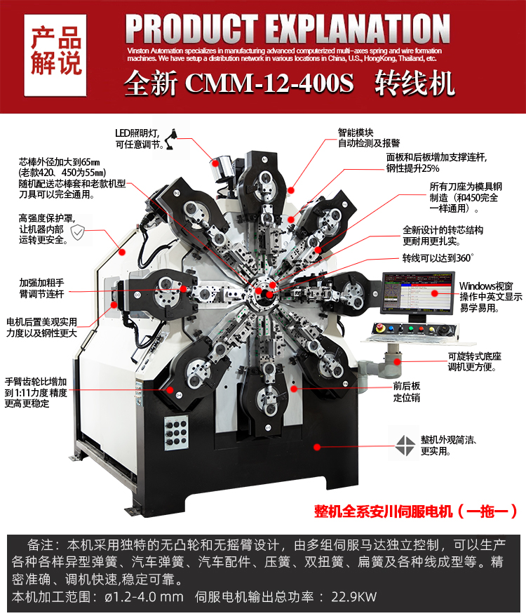 - 產品概述: CMM-12-400S 轉線彈簧機可生產?1.2-4.0 mm線徑彈簧及線成形等),本機采用獨特的無凸輪和無搖臂設計,由多組伺服馬達獨立控制,可以生產各種各樣異型彈簧、汽車彈簧、汽車配件、壓簧、雙扭簧、扁簧及各種線成型等。精密準確、調機快速、穩定可靠。
