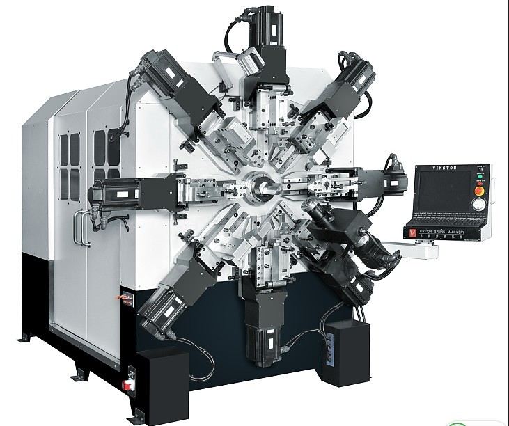 永騰無凸輪彈簧機在國內的應用,在近幾年間逐漸得到認可。與傳統帶凸輪電腦彈簧機相比,無凸輪彈簧機在設計上采用獨特的無凸輪和無搖臂技術,其中刀架采用八組伺服馬機獨立完成驅動控制,調試過程中節省了排凸輪片的時間,而且更方便多角度彈簧產品成形,具有調試方便、加工能力強和成形速度快等特點。