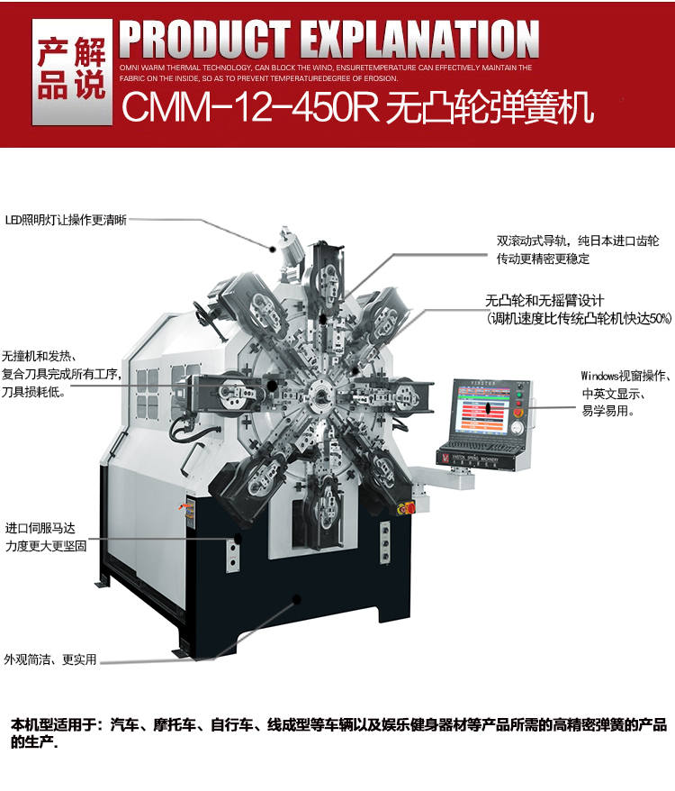 其次,永騰無凸輪彈簧機上無滾動式導軌,可長久保持精度。無撞機和發(fā)熱,復合刀具完成所有工序,工具損耗低。適用于汽車、摩托車、自行車、線成型等車輛以及娛樂健身器材等產品所需的高精密彈簧的產品的生產.