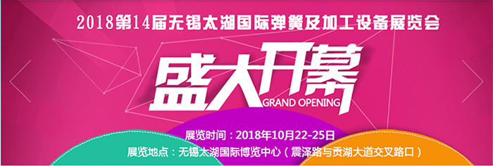 各位新老客戶2018第十四屆無錫太湖國際彈簧及加工設備展覽會將于時間:(2018.10.22 ---10.25)在無錫太湖國際博覽中心舉辦。屆時將吸引來自世界五大洲的彈簧行業精英人士共同研究、探討彈簧行業的發展,同時來自德國、日本、 中國(香港、臺灣、內地)的200家彈簧設備制造廠家將展示他們前沿的彈簧制造技術。在此,永騰熱烈歡迎國內外彈簧生產、 制造及汽車配件制造相關行業的客商光臨永騰展位(展位號:B1-01),共同為推動中國彈簧制造工業的發展而努力!