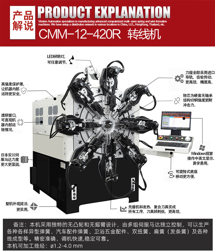 - 產(chǎn)品概述: CMM-12-420R轉(zhuǎn)線機(jī),彈簧機(jī) 可生產(chǎn)?1.2-4.0 mm線徑彈簧及線成形等)本機(jī)采用獨(dú)特的無(wú)凸輪和無(wú)搖臂設(shè)計(jì),由多組伺服馬達(dá)獨(dú)立控制,可以生產(chǎn)各種各樣異型彈簧、壓簧、拉簧、雙扭簧、電池簧、扁簧(發(fā)條簧)及各種線成型等。精密準(zhǔn)確、調(diào)機(jī)快速、穩(wěn)定可靠。