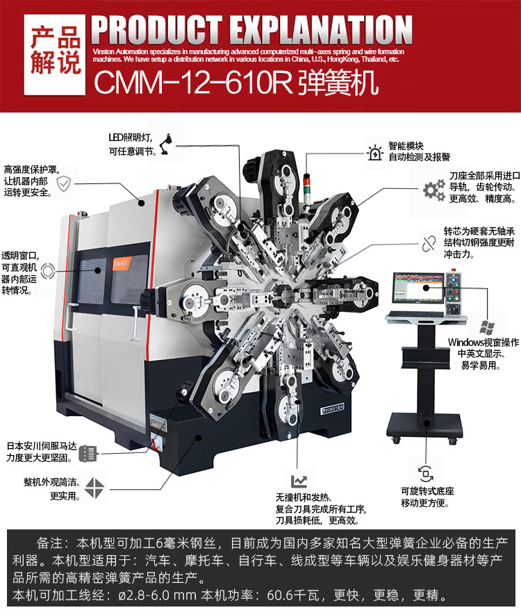 本機(jī)型適用于汽車、摩托車、自行車、線成型等車輛以及娛樂健身器材等產(chǎn)品所需的高精密彈簧產(chǎn)品的生產(chǎn)。