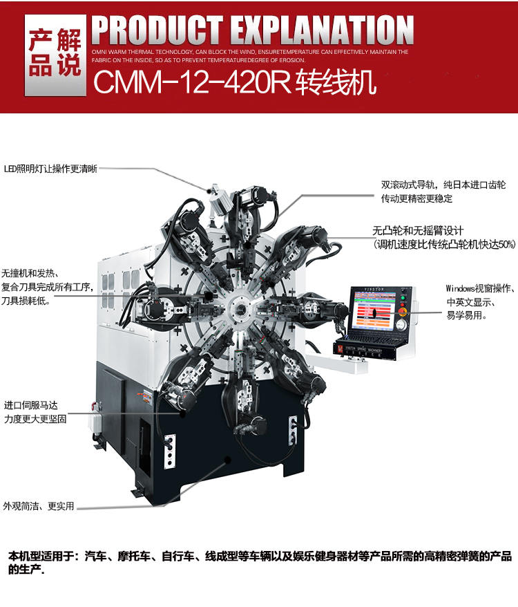 獨特的無凸輪和無搖臂設計,由多組伺服馬達獨立控制,可以生產各種各樣異型彈簧、壓簧、雙扭簧、電池簧、扁簧(發條簧)及各種線成型等。精密準確、調機快速、穩定可靠。