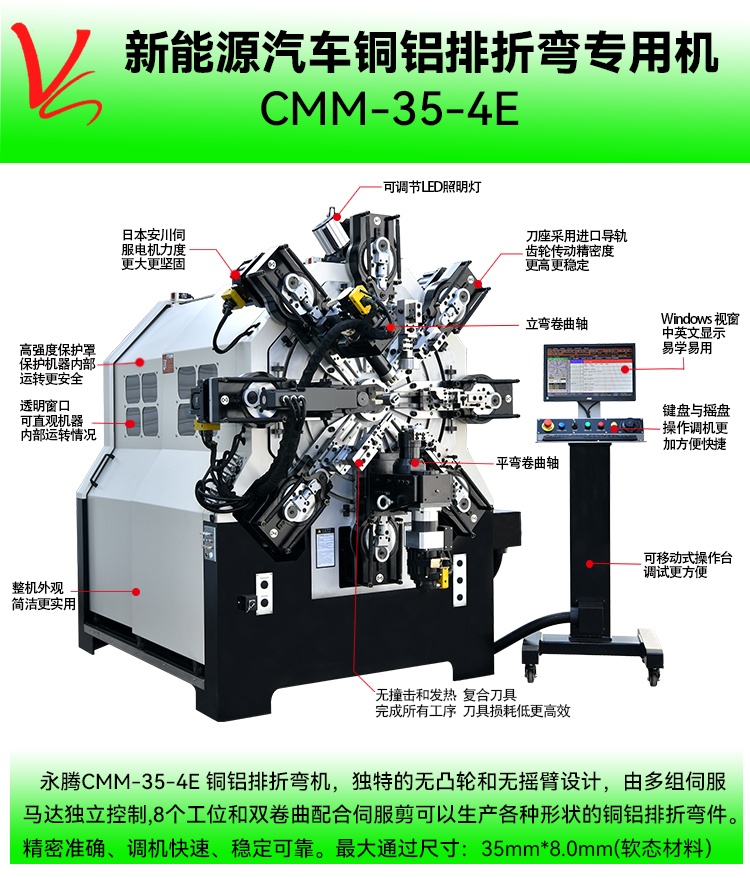 - 產品概述: CMM-35-4E銅排折彎機(最大通過尺寸:35mm*8.0mm)集3D折彎機和彈簧機所有的功能于一體的多功能專用機,本機采用獨特的無凸輪和無搖臂設計,由多組伺服馬達獨立控制,永騰銅排折彎機廣泛應用于導電排成型,新能源電池連接排、新能源電池模組、銅母排成型、硬排成型、導電排、電池連接排、銅排、裸排成型等。精密準確、調機快速、穩定可靠。